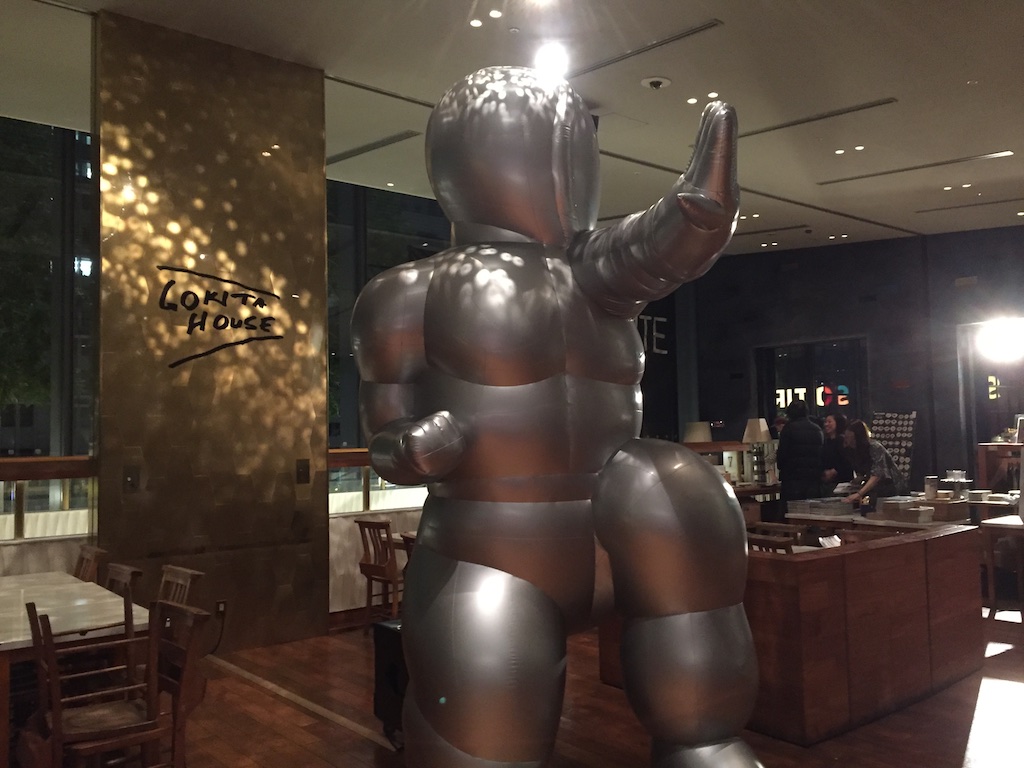 僕の中で五木田さんといえば、DICでやっていた展覧会のイメージが強くモノクロの溶けた人物のような画像やストリート感のあるモノクロ絵画を作っているイメージだったのですが、今回の丸ビルでの展覧会では大きなバルーンの人形があったり、彫刻、棒のような立体、フラッグのようなものまで自由によりストリート感のある作品がありました。