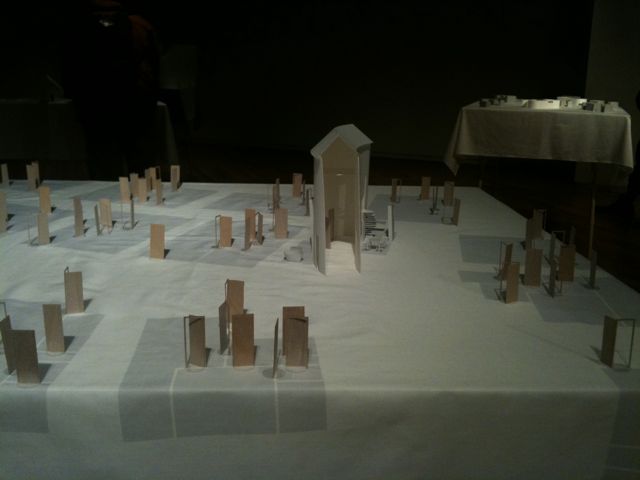 展示方法は恐らく自分で作ったような机の上に敷地と見立てたテーブルクロスを敷いて、その上に建築模型をならべていて、なかなか見やすくて面白い模型の見せ方をしているなという感じになっていました。これからどんな作品をつくるのかが楽しみですね。