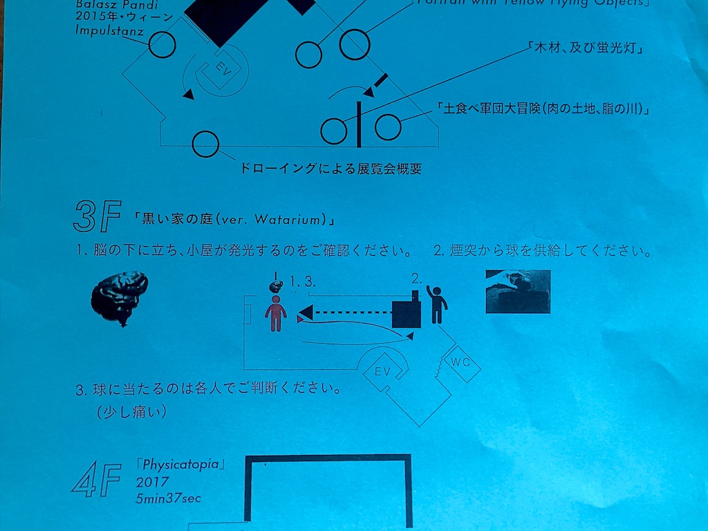 注目していた「黒い家の庭」という作品は、そのボールがぶつかるまでの緊張感と実際にぶつかった時に少し痛い(配られた上にも注意で書いてある。笑)という、これがコンタクトゴンゾに触れたような気がしてすごく良かったです。展覧会内容にあるように「殴られてるのに笑える。 Punching,」という感じ。なんだかボールをぶつかって痛かったという体験を共通に持っている人たちと妙な連帯感が生まれた気すらしました。