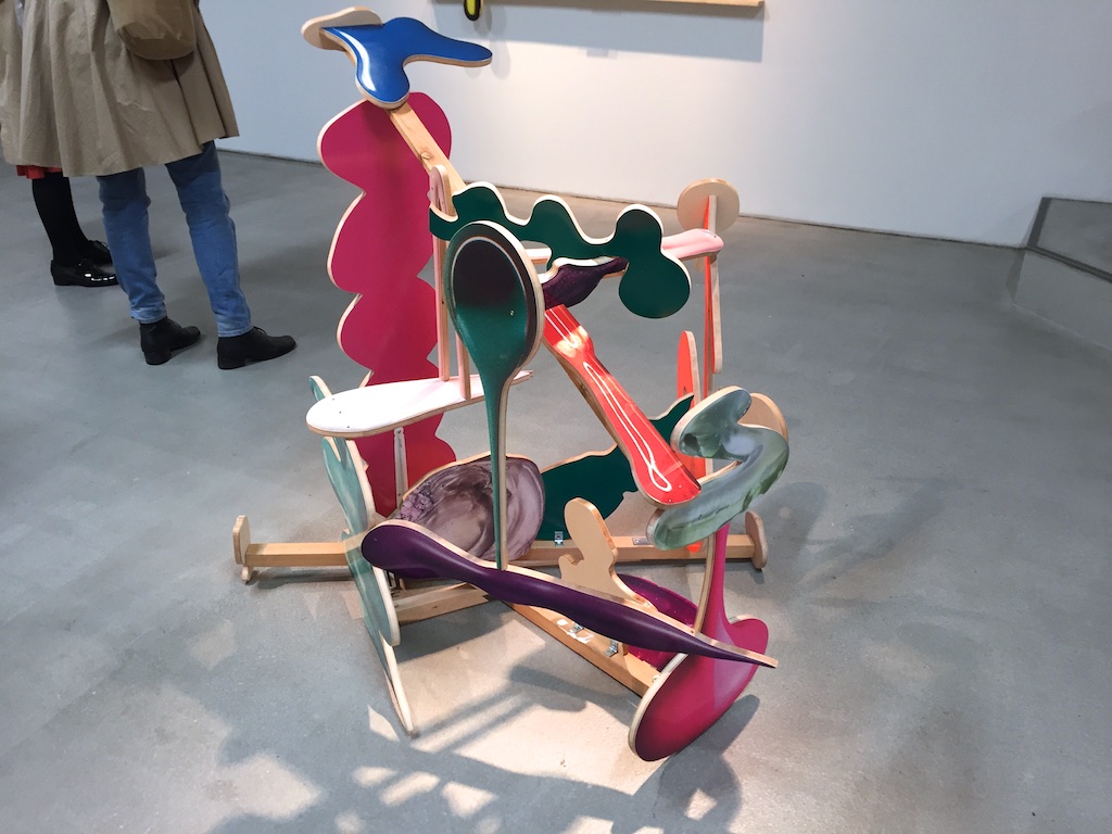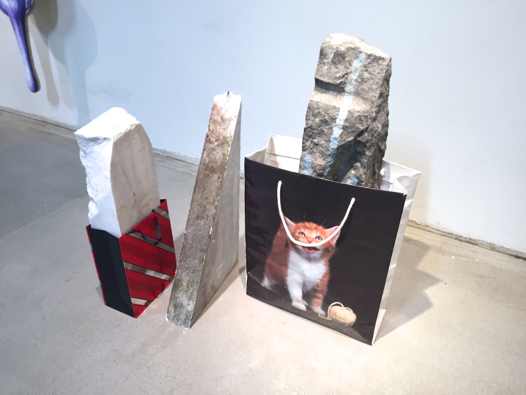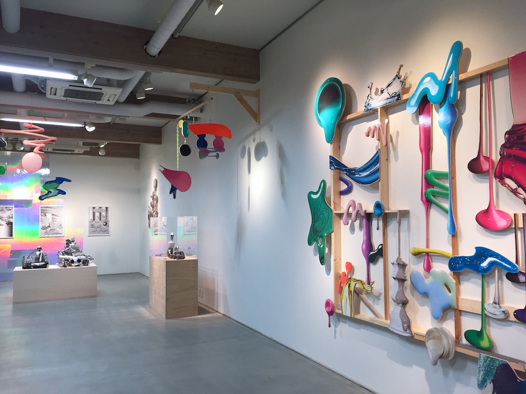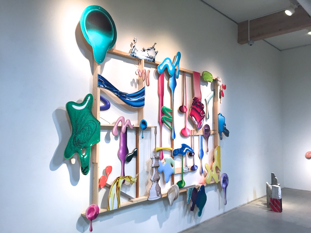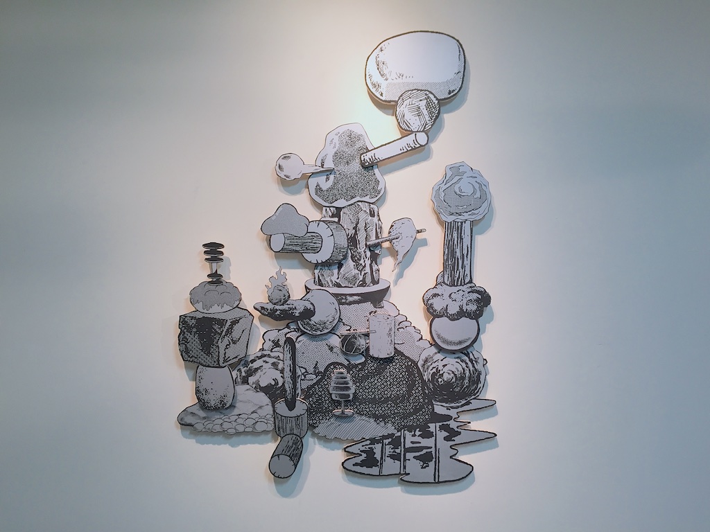 最近よく見るようになったモビール的な作品とリキッドを切り取った大きな立体作品、漫画のようなものを重ねた作品や、時々見るソフトスカルプチャー的な作品とあまり見たことがない石や地味な色のものを重ねた彫刻というような様々なものがある展示でしたが、いつも通り作品としては何かと何かを出会わせて掛け合わせることで新たな形や作品を産んでいるようなものたちでした。